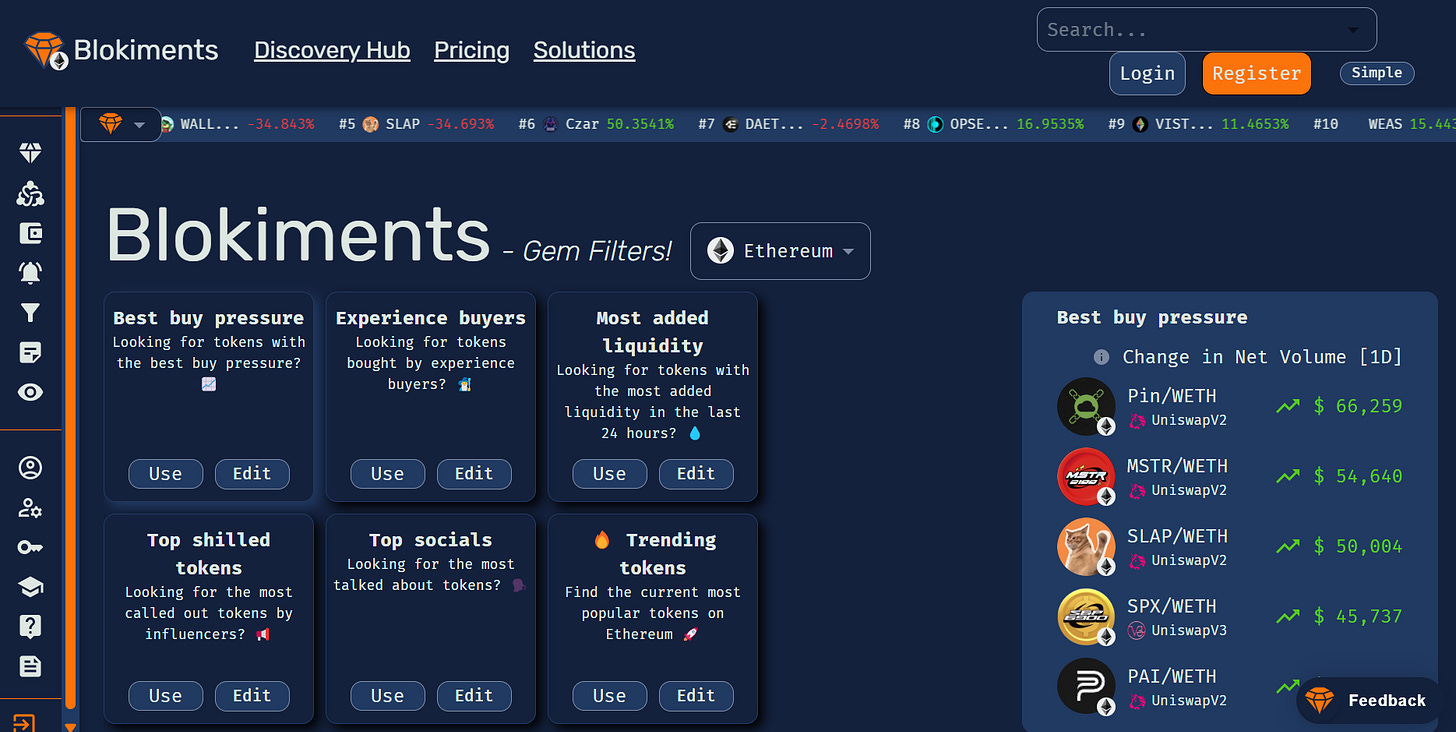 Use Blokiments’ intuitive interface to design your ideal token search strategy. Want tokens with high liquidity, active social engagement, and minimal scam risk? The platform’s advanced filters make it effortless.