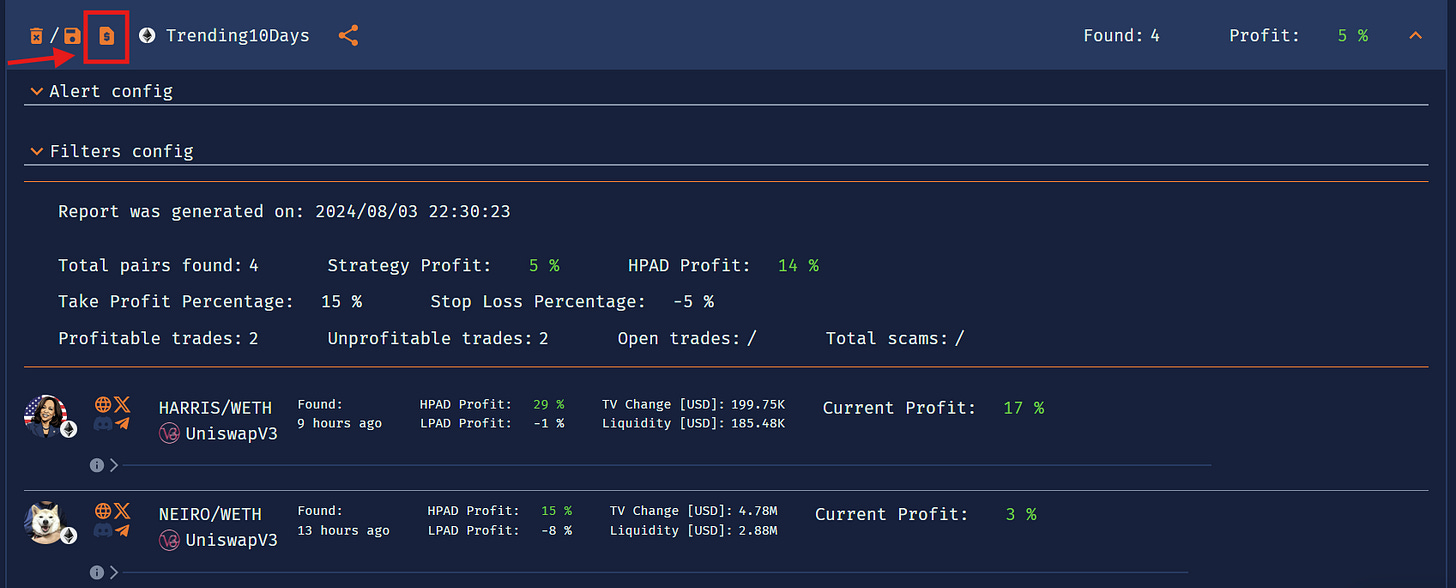 The main info in this part is total found pairs, strategy profit (real profit if you would buy and sell the token with the suggested optimized take profit and stop loss percentage, HPAD - highest profit percentage after the alert config found the token, the statistic of the trades)