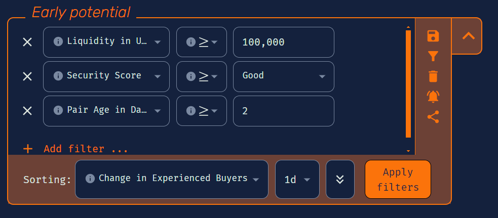 This page's main function is to find new tokens based on advanced filtering. We provide more than 50+ filters in different categories. Let's start with a simple yet strong filter configuration for the Ethereum network (supported networks). We select the following three filters.