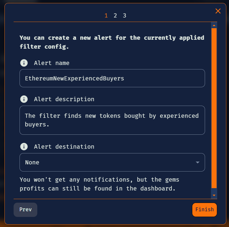 You can add the name, the description (it's for you - it's easier to get organized when you have multiple alerts), and the alert destination. It currently supports Discord, Telegram, and Webhooks. The option we will use today is None, which won't notify you, but you will still be able to find the alerted gems and their profits in the dashboard (more about that in the next section).