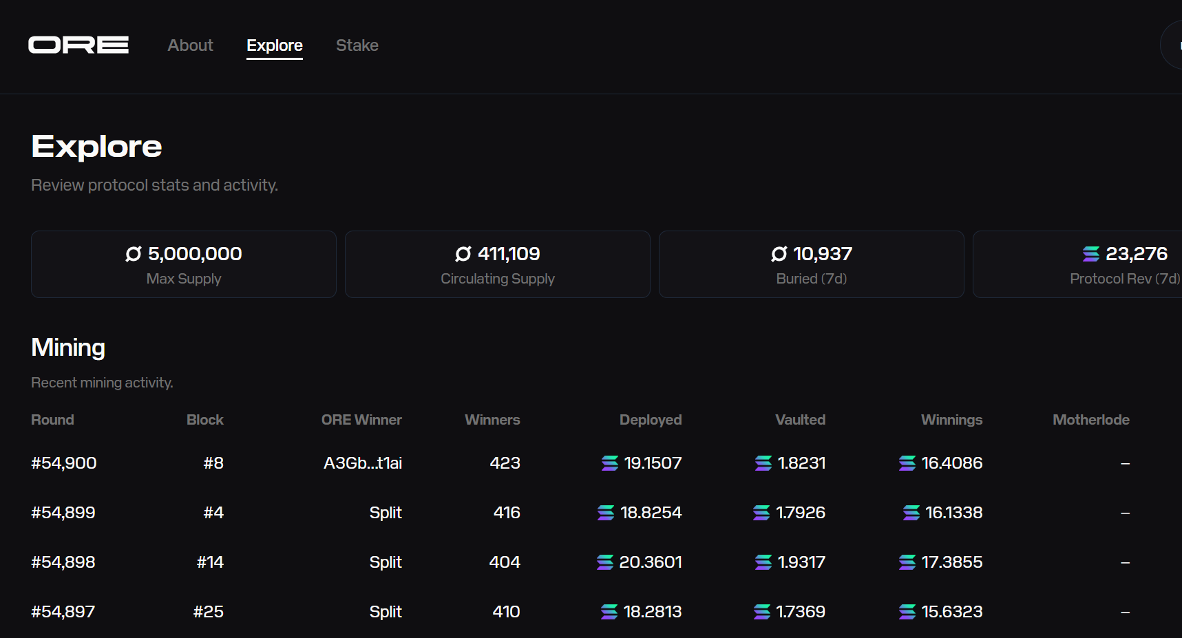 ORE mining involves deploying SOL tokens to claim squares on a 5×5 grid. The winning square is determined by on-chain randomness, and rewards are distributed proportionally based on your SOL deployment relative to all miners on that square