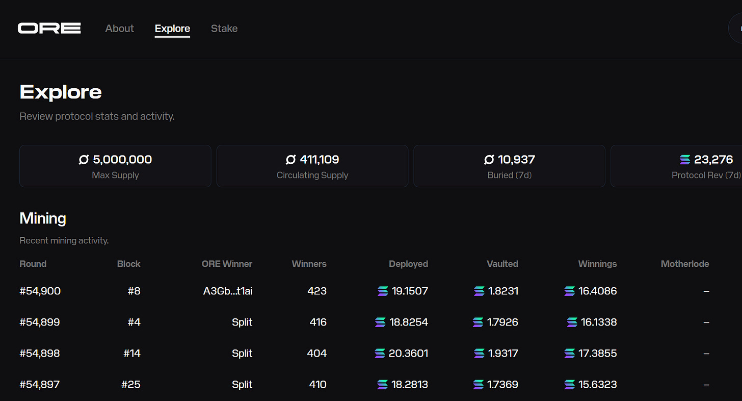 in 7 days have generated over $3.5M. Circulating supply is under 500k, and issuance is fixed at just 1 ORE per minute. More than half of all mined ORE is already staked, meaning the majority of supply is locked, not sold. On top of that, ORE’s revenue engine is printing about millions per day, and every dollar feeds continuous buybacks—90% is permanently removed from supply, while 10% flows directly to stakers.