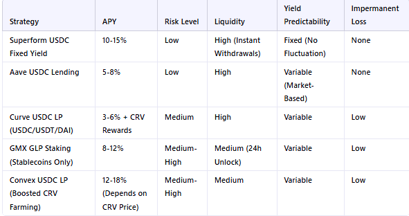 From this breakdown, it’s clear that Superform’s fixed yield strategy outperforms lending protocols like Aave in terms of yield while offering greater stability than LP farming or DeFi derivatives.